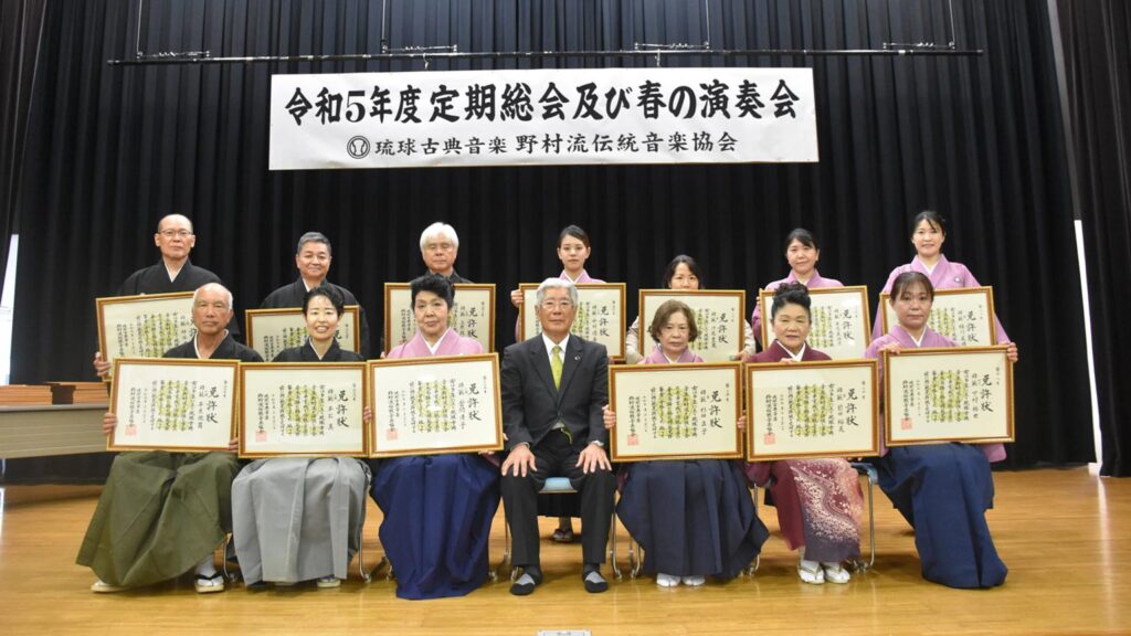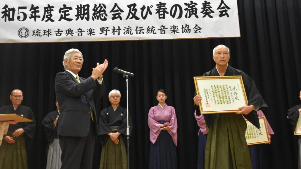 当会師範・中村一雄は、伝統的な琉球古典音楽の技法を高度に体現し,積極的な舞台活動を展開して卓越した技量を示していること。また,斯界の発展及び後進の指導・育成にも尽力していること等が評価され、2019年(令和元年)10月、国指定重要無形文化財「琉球古典音楽」保持者(各個認定) =いわゆる「人間国宝」に認定されました。