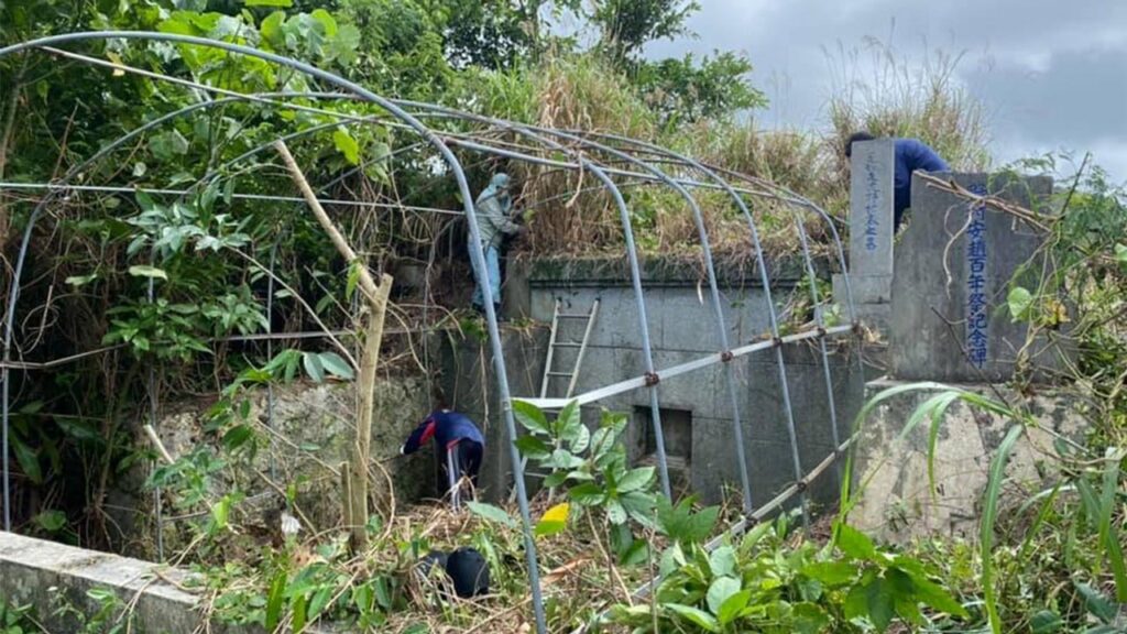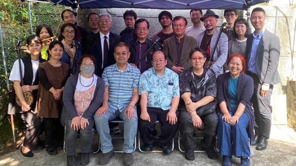 毎年清明祭の時期に、那覇市識名にある野村流の始祖・野村安趙先生のお墓掃除を行っています。2022 年から始まった取り組みで、団体の垣根を越えて、野村流を学ぶ有志が集まります。掃除を終えたら、感謝を込めて歌三線の献奏をしています。
